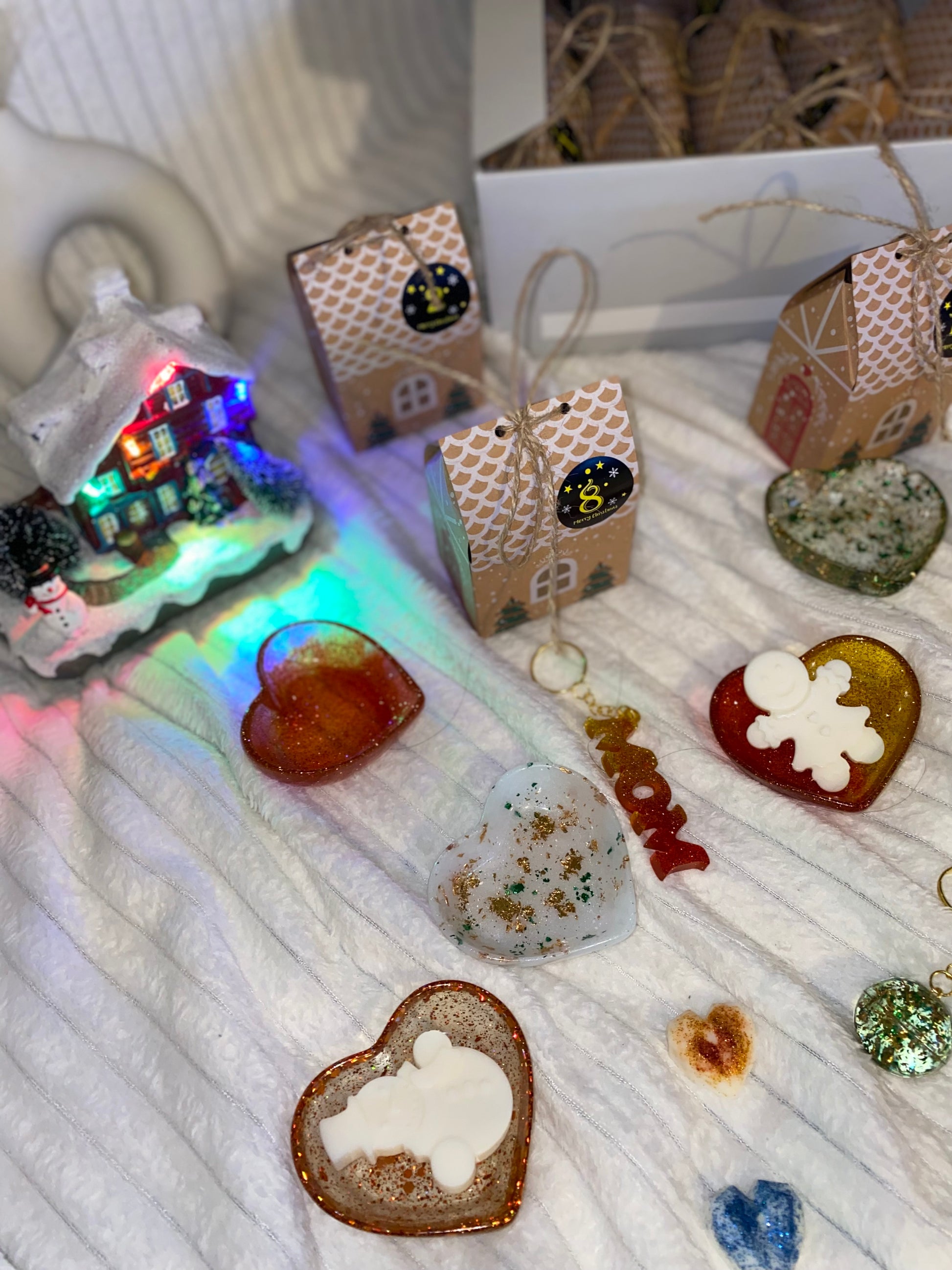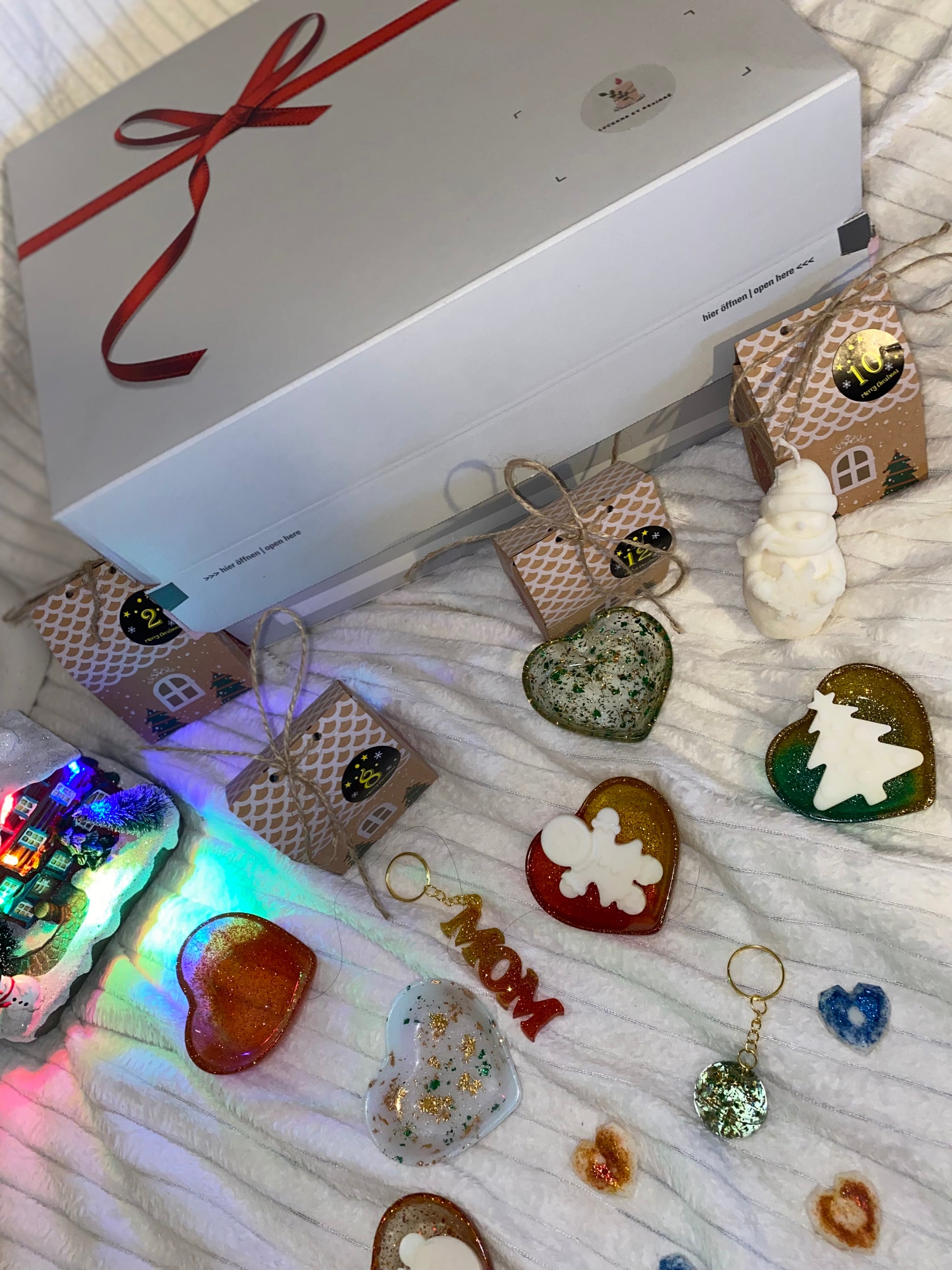 À l’intérieur, retrouvez des fondants parfumés à base de cire de soja, une bougie délicatement parfumée, et de multiples petits trésors comme des boucles d’oreilles, des porte-clés artisanaux, et même un vide-poche élégant. Chaque article a été soigneusement fabriqué à la main, garantissant des pièces uniques aux couleurs variées. Bien que les catégories de produits soient les mêmes pour chaque calendrier, les couleurs, les formes et les détails varient d’un coffret à l’autre, rendant chaque calendrier véritablement unique.